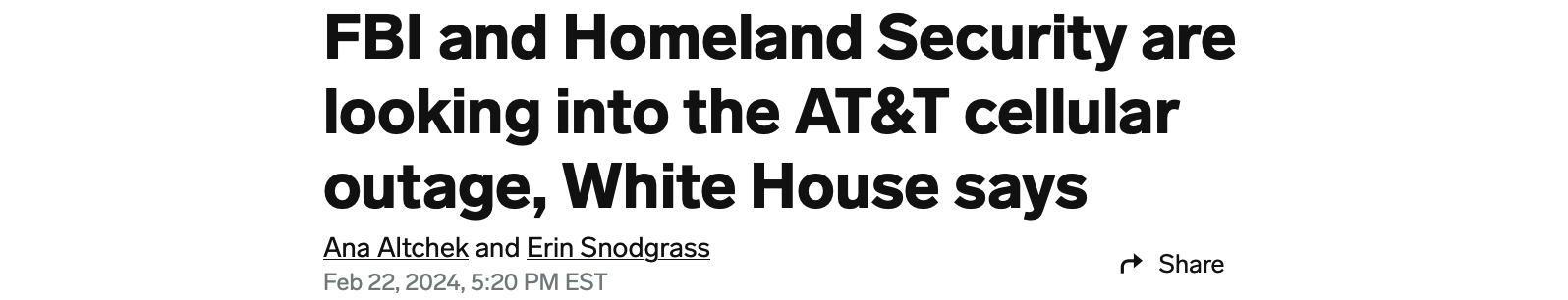 I also thought I was on the right track when, showing unparalleled alacrity and agility, within just a few hours, every law enforcement arm of the federal government and our top political leaders all sprang into action, opening urgent investigations into the “AT&T Outage.” Clearly, I wasn’t the only one suspicious of cyber hijinks.