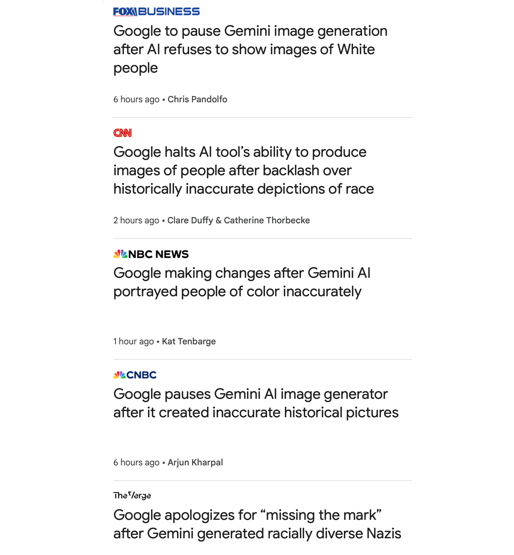 Google’s AI hilariously produced pictures of diverse historical figures in the most unlikely configurations. The story quickly broke into corporate media, producing many uproarious, side-splitting headlines. Here’s just the top of yesterday’s list of headlines from Google News. The final one was my favorite, though NBC’s was a close runner-up: