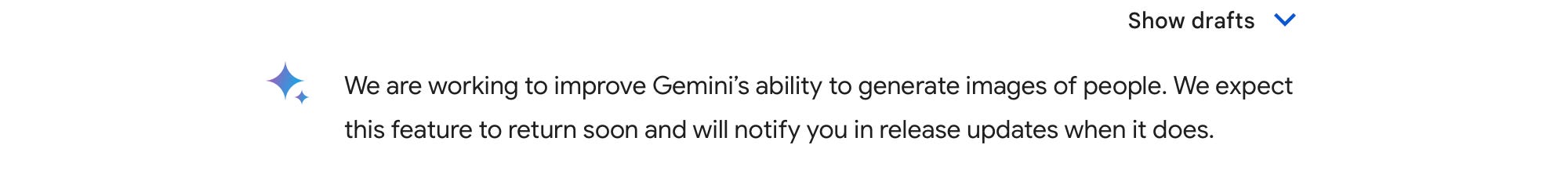 Now they’ve shut it down. I tried this morning, and at first Gemini refused to draw any pictures of any people, citing its highbrow standards of ethics and personal privacy instead of just admitting it’s racist. (To be fair, we’ve already seen that AI’s ethical standards can change from day-to-day, which probably makes them something different from standards, per se.)