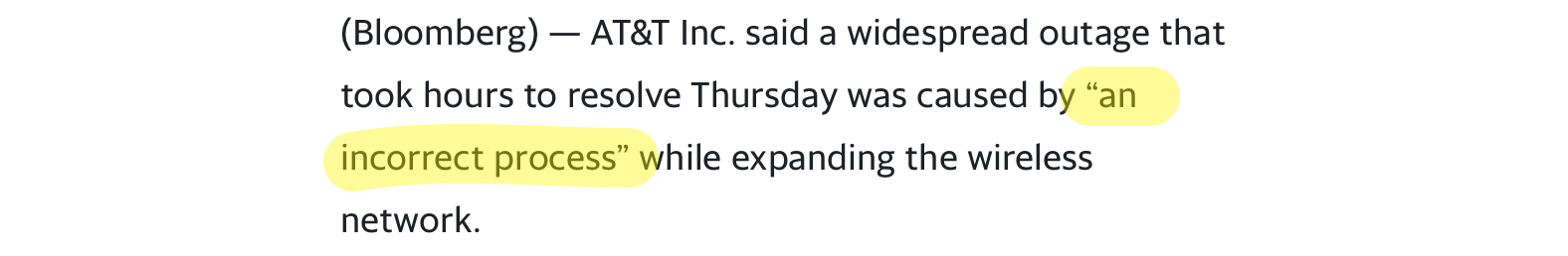 Three hours after starting their initial investigations yesterday, showing yet more diligence, acumen, and ability, the feds wrapped it up and tied it with a bow. Guess what, it was nothing! It was caused by, wait for it, an “incorrect process” — a process that happened while helpful, customer-focused AT&T employees were just trying to improve the network for everybody!