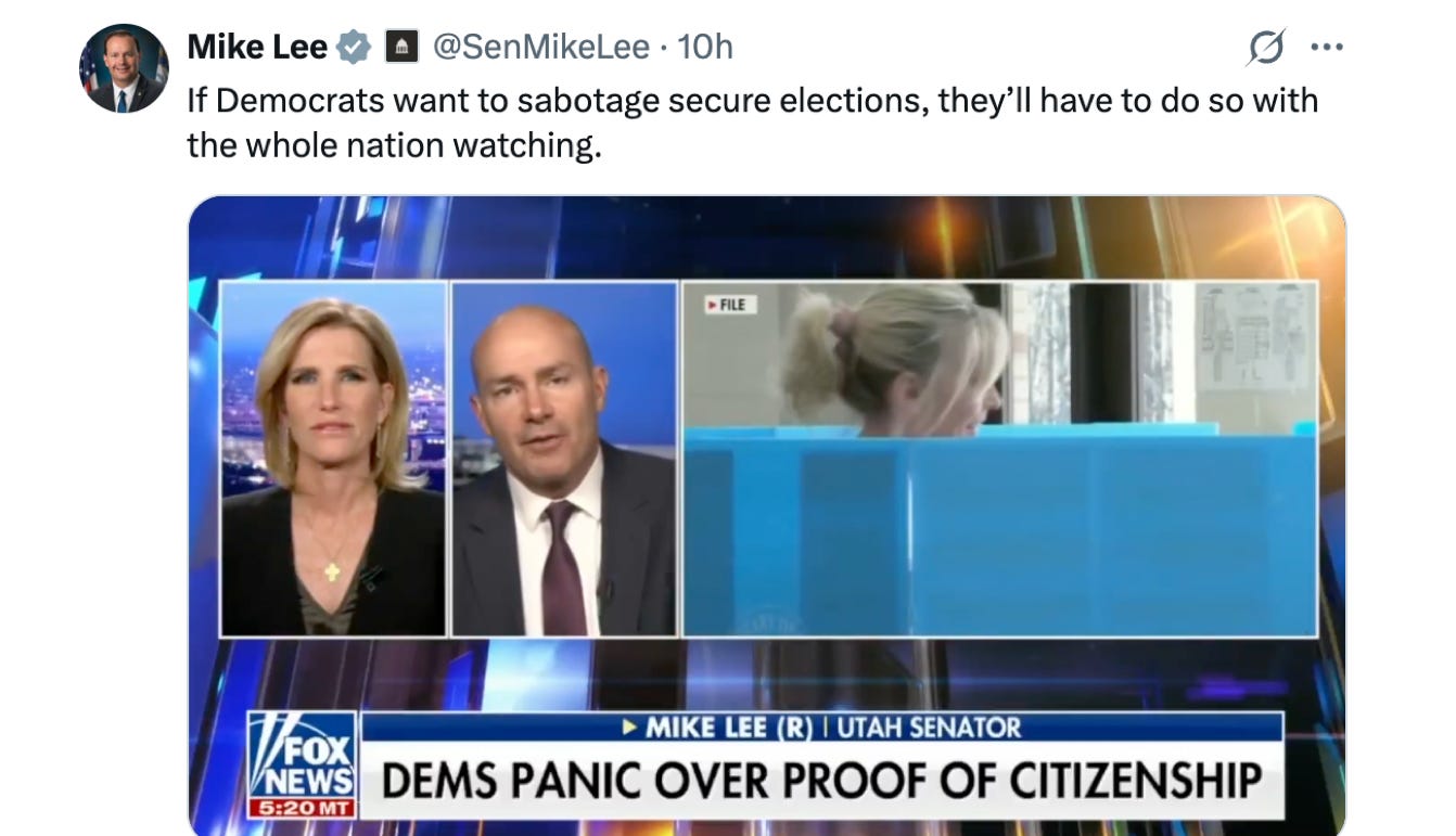 Utah Senator Mike Lee dropped a terrific tweet yesterday announcing that Senate Majority Leader John Thune agreed to force Democrats into a talking filibuster over the SAVE America Act, the bill requiring documented proof of citizenship to register to vote and a photo ID to actually cast a ballot. The House already passed it in February. Now it finally arrives in the Senate, where Democrats had planned to quietly smother it with the silent filibuster— the procedural trick requiring sixty votes instead of fifty-one, but nobody ever has to stand up and explain why.