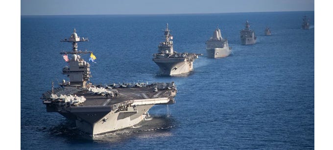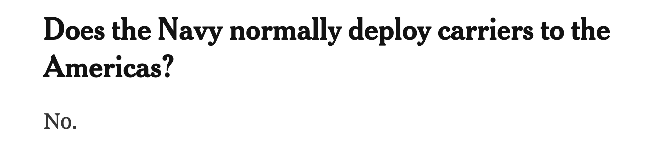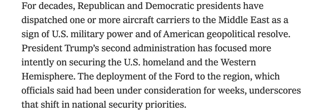 It’s not just ‘a carrier.’ Carrier Strike Group 12, which includes the brand-new (2017) carrier Gerald R. Ford, plus five guided-missile destroyers, plus support craft and jets, plus (possibly) one or more stealth attack submarines, is now sailing toward the sunny shores of South America. Here’s how the Times’ explainer article petulantly described the historic assignment: