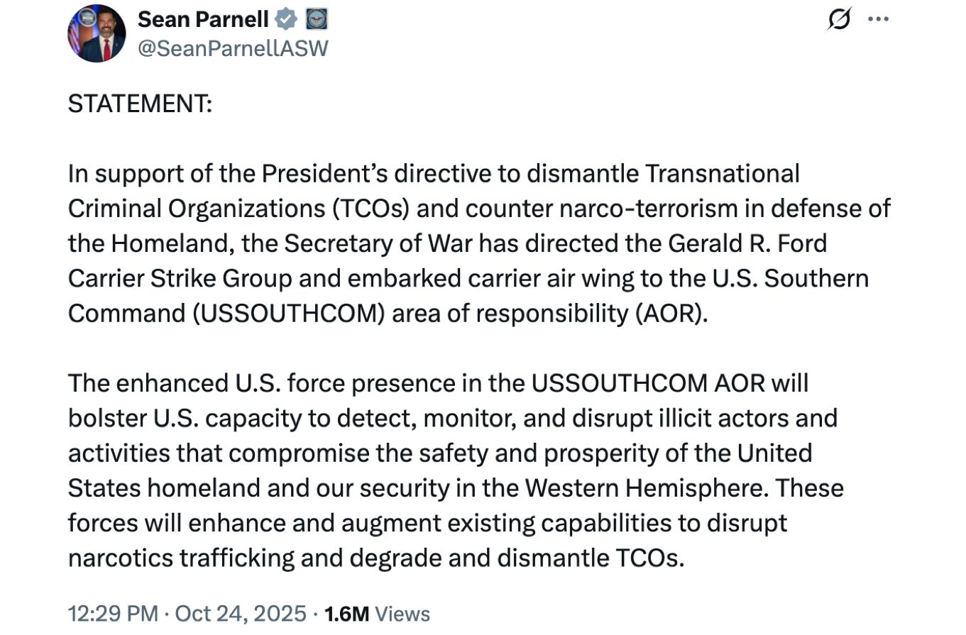 Whether land-based strikes are on the cards or whether this is just “carrying a big stick,” it seems President Trump is deadly serious about not letting any more narco-ships and submarines haul fentanyl to American shores. Pentagon spokesman Sean Parnell tweeted the announcement yesterday: