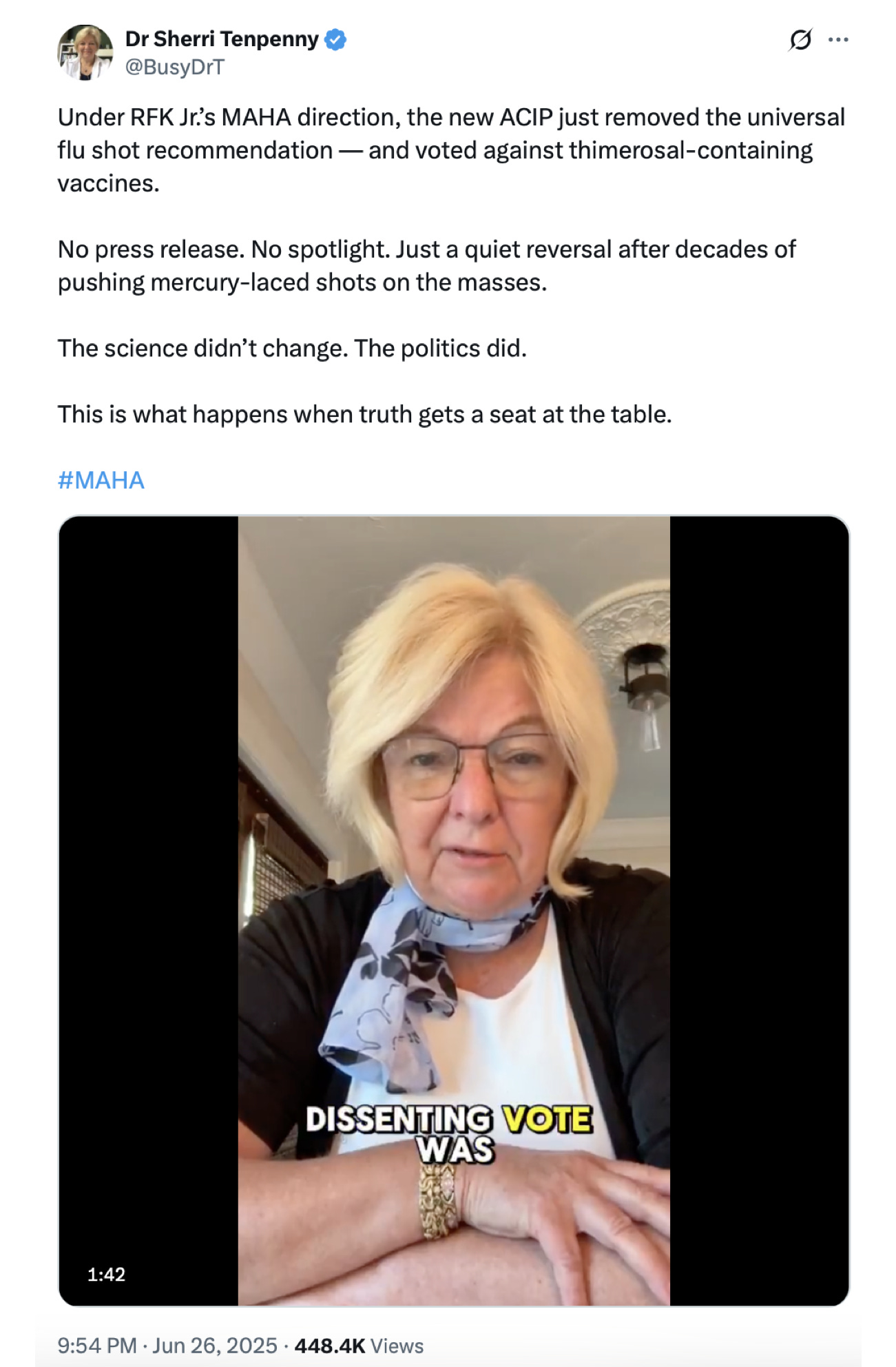 In the clip, Dr. Tenpenny obviously recognized that the new ACIP committee did everything politically possible to reverse decades of slavish vaccine adherence by our public health agencies. But there’s still a blackpilled vein of dissatisfaction running through MAHA, which snipes relentlessly at brave health freedom pioneers from the bushes.