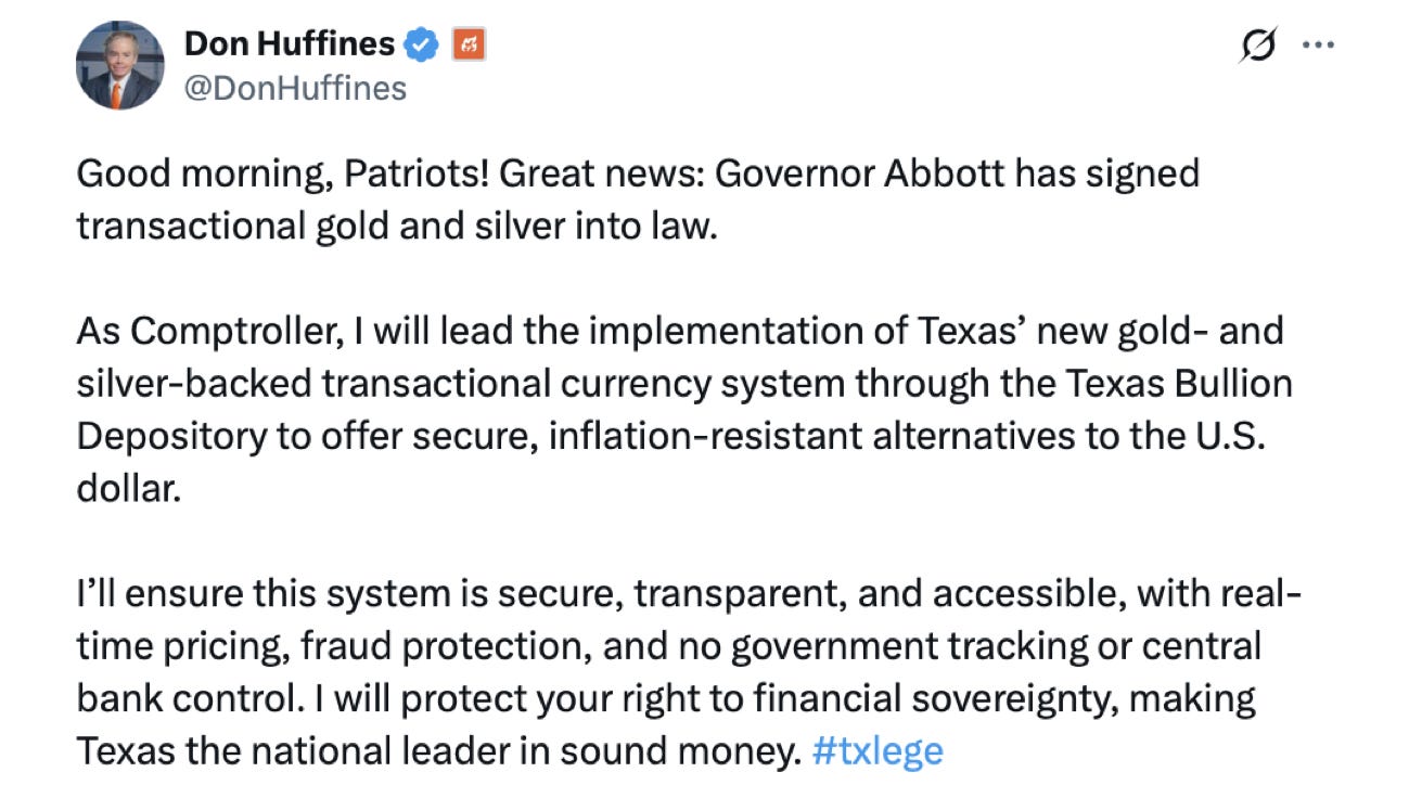 🔥 Yesterday, AInvest News ran a story headlined, “Texas Authorizes Gold, Silver as Legal Tender for Daily Transactions.” Texas’s comptroller announced that Governor Greg Abbott signed a new law making gold and silver legal tender in that state: