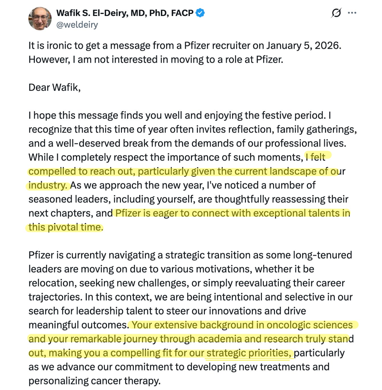 And here’s the best part, the most delicious irony: the offer itself proves all his critics wrong. Dr. El-Deiry isn’t a crank. He isn’t deluded. He isn’t a bad scientist. Because if he were, Pfizer wouldn’t have tried to hire him, would they?