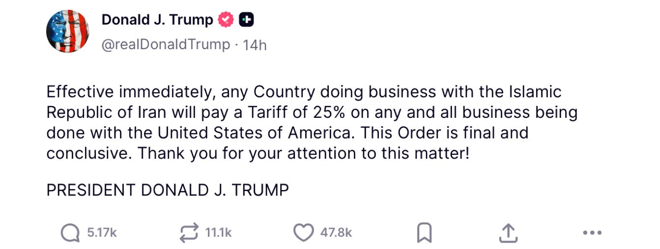 Rather than tariff Iran directly —which would probably be useless, since Iran already lies under lasagna-like layers of sanctions— Trump announced “effective immediately” tariffs of 25% on “any country doing business with” Iran. Nobody seems to know which countries will be affected, what “doing business with” means, or any other details. We await clarification of the Presidential post. Thank you for your attention to this matter.