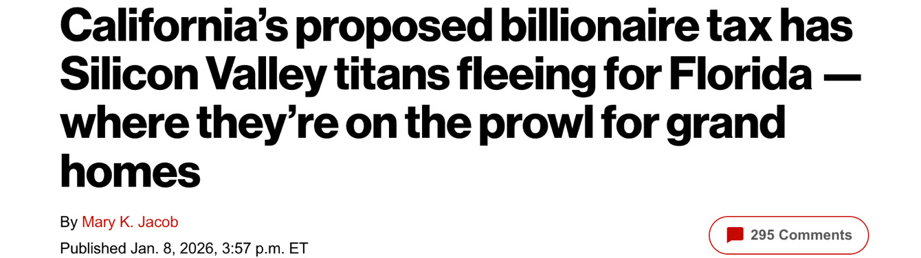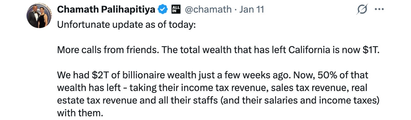 Many billionaires didn’t wait around to find out how this Old West train robbery story will play out. With a retroactive deadline rushing at them like a locomotive filled with financial gunslingers, they got out of Dodge. According to an estimate from tech billionaire Chamath Palihapitiya, half of California’s billionaire wealth hastily evacuated before the January 1st deadline: