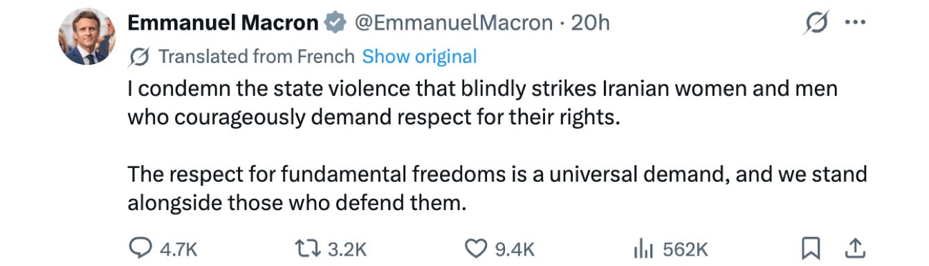 French President Emmanuel Macron did the same, complaining about Iran’s crackdown on protestors, not about America’s potential role: