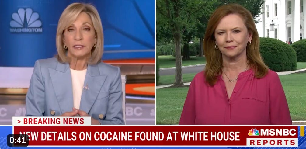 You probably didn’t even notice the surreptitious narrative switcheroo, but as the investigation unfolded last week, NBC News quietly dropped that the cocaine had been discovered in a “much more secure” area than initially thought, putting the lie to previous claims by mendacious White House officials that it had been found in a “high-traffic area” frequently used by visitors. Both Andrea Mitchell (MSNBC) and Kelly O’Donnell (NBC) confirmed that SOMEBODY’S recreational drugs were found in SECURE AREAS near the Situation Room and Studio 54, I mean the West Executive entrance.