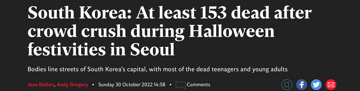 Finally, there was this UK Independent headline from last October, 2022, about a Seoul, South Korea mass casualty event: