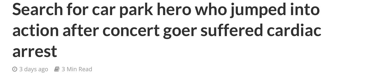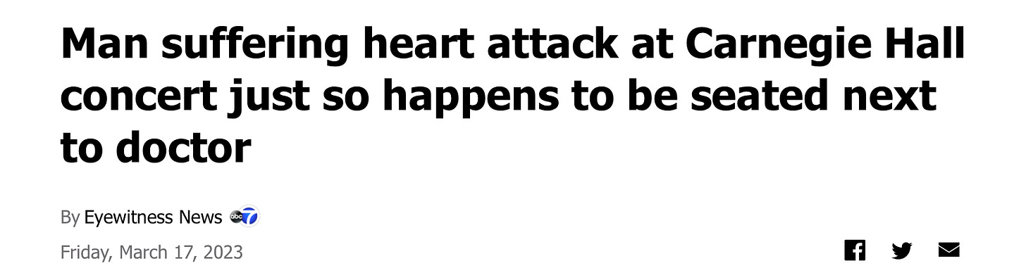I’m going to make a wild guess here and speculate that, without some additional factor of news interest, like a performer’s heart attack, a mystery hero, or a coincidental doctor in the next seat, most cardiac arrest incidents at large events won’t even make the local news. So there’s probably no way to get the data, and the officials aren’t going to check. Once again, we’re left speculating.
