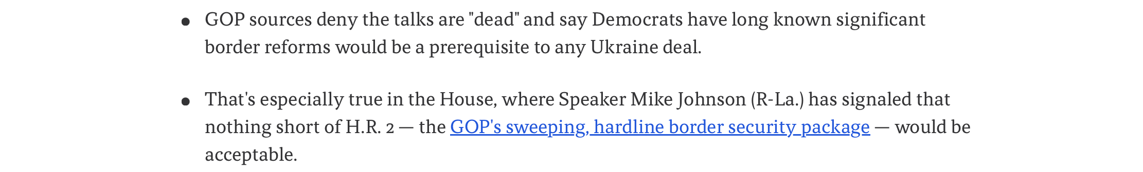 Triple stalemate! It’s three times worse than a regular stalemate. Encouragingly (for us), the Axios article whined that House Republicans are forcing President Robert L. Peters to fix our border problem before the deep state can get any more cash for its Eastern European crack house: