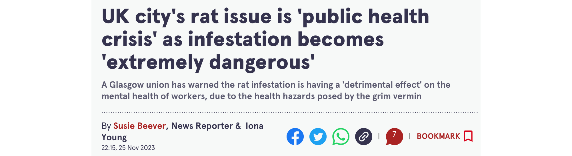 So I kept digging, and there’s no denying it now. We’re facing the next global pandemic: a pandemic of rats. And things are getting downright dangerous. Even extremely dangerous. Headline from the UK Mirror, November 25th, about Glasgow, Scotland: