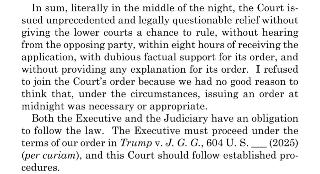 ⚖️ And so we return to Justice Alito’s scathing dissent, which reads like a manifesto for suspension of the writ. The logic and tone of Alito’s dissent make it clear that he sees judicial overreach as the true constitutional crisis, rather than executive enforcement.
