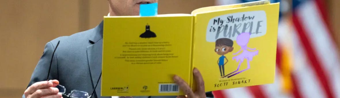 The book in question is titled “My Shadow is Purple,” and as is obvious from its cover, above, it depicts a little boy imagining his shadow is dressed in a tutu. Obviously he’s thinking he must be a girl.
