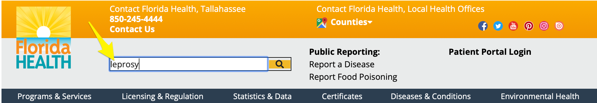 So it’s curable. But still, it’s leprosy. The logical first place to look was the Florida Department of Health website, where one would expect to find critical, up-to-the-minute disease updates about the new outbreak. There was nothing on the home page so I searched for it: