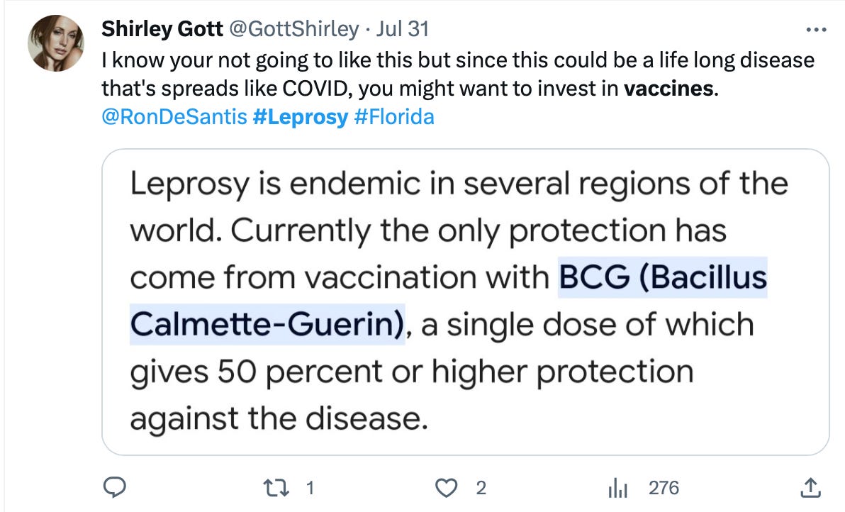 Oh. So let’s count them up. The doctors at Shands — a major Central Florida research hospital affiliated with the University of Florida — aren’t that concerned about leprosy. Florida’s Department of Health isn’t that concerned about leprosy. Apart from its ridiculous travel advisory, CDC doesn’t seem that concerned about leprosy.