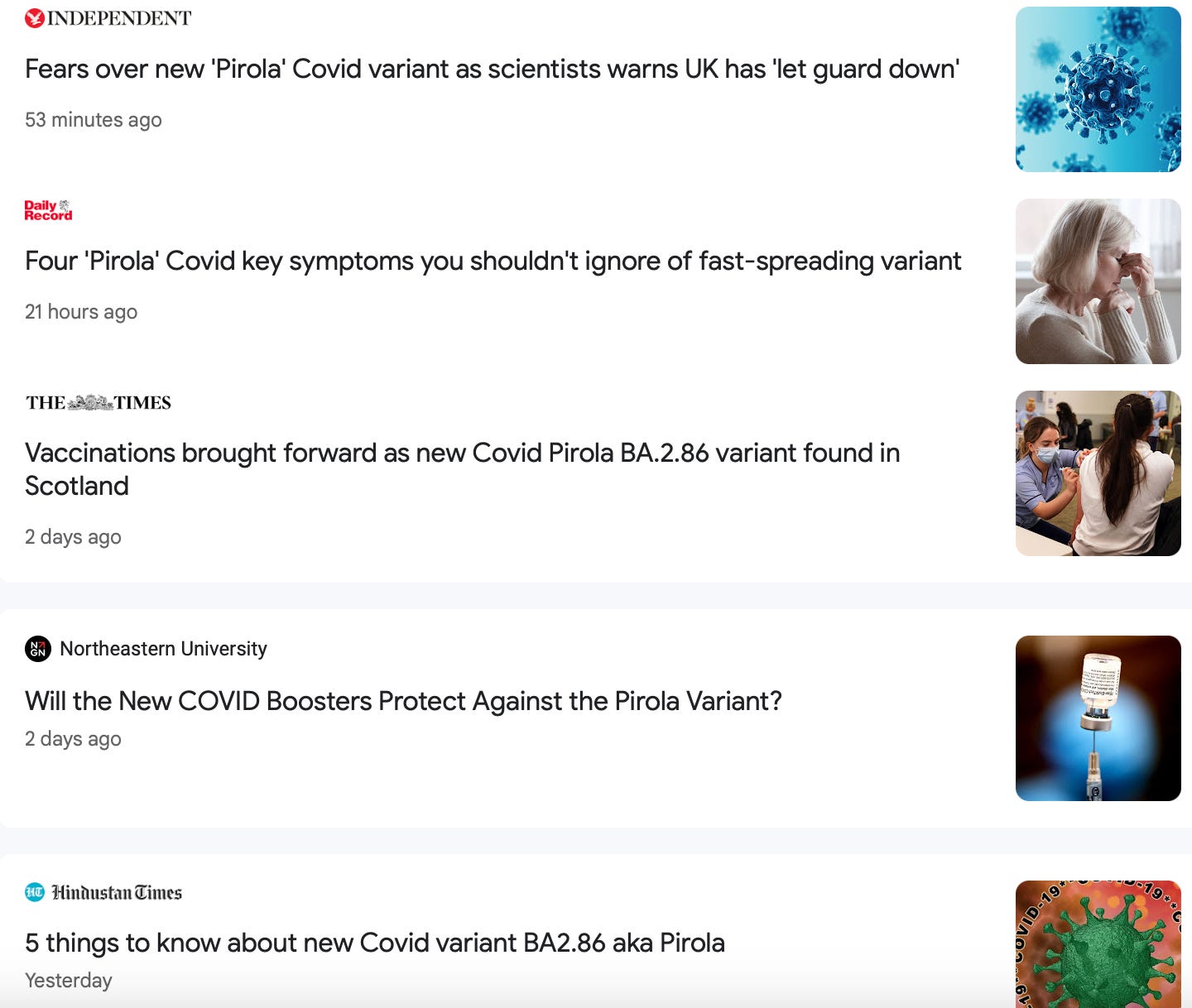 🔥 Goodbye, Eris variant, we hardly knew ye. Hello, Pirola! The New York Post ran the story yesterday headlined, “New ‘Pirola’ variant of COVID is spreading fast, has experts concerned.”