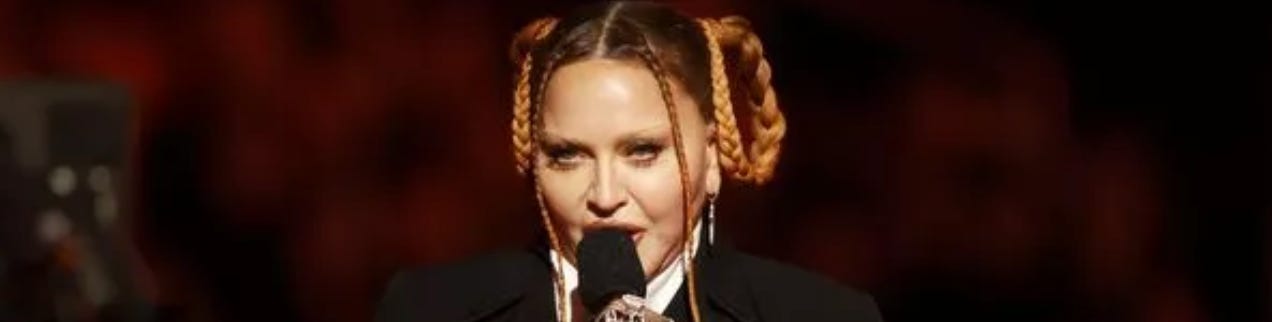 💉 Madonna update! The occultist pop legend is back in business. The UK Daily Mirror ran the story yesterday headlined, “Madonna says she's back to rehearsals for her world tour after terrifying collapse.” Well thank goodness.