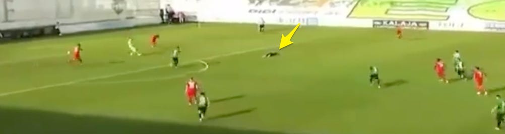 Video shared widely on social media shows Raphael standing by himself and then just falling over on the field — only 24 minutes into the match. Just … plop. Nothing hit him in the chest. Nothing even got close to his chest. He was just standing around.