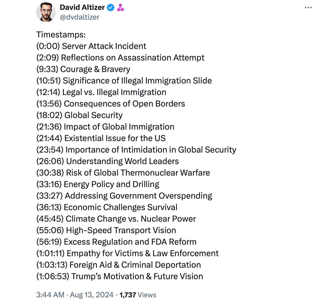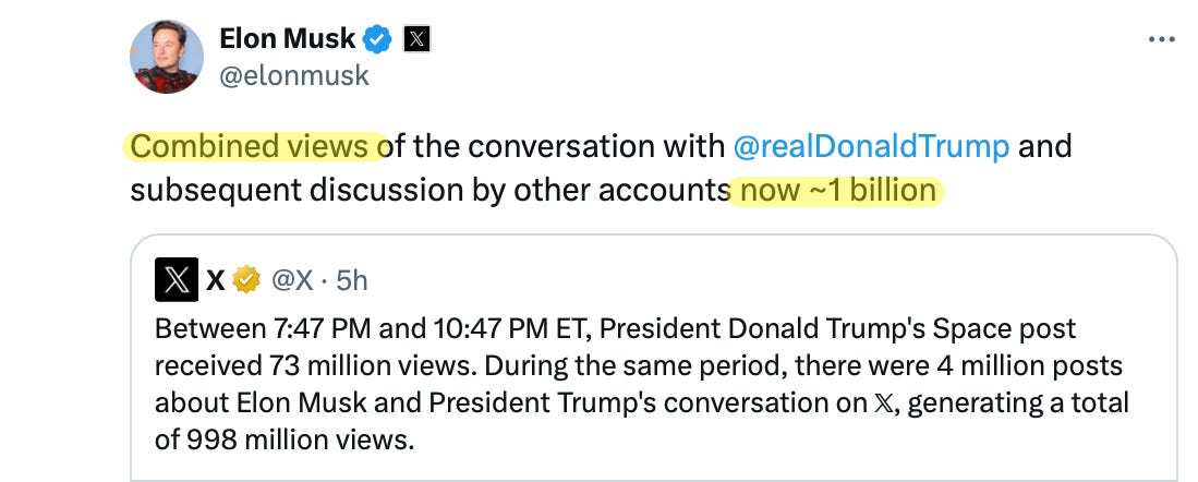 🔥 Early this morning (2:30 am EST), Elon Musk reported the stunning news that, adding the people who tuned in to the interview to the folks who listened afterwards, Trump’s interview had been heard more than an astounding billion times.
