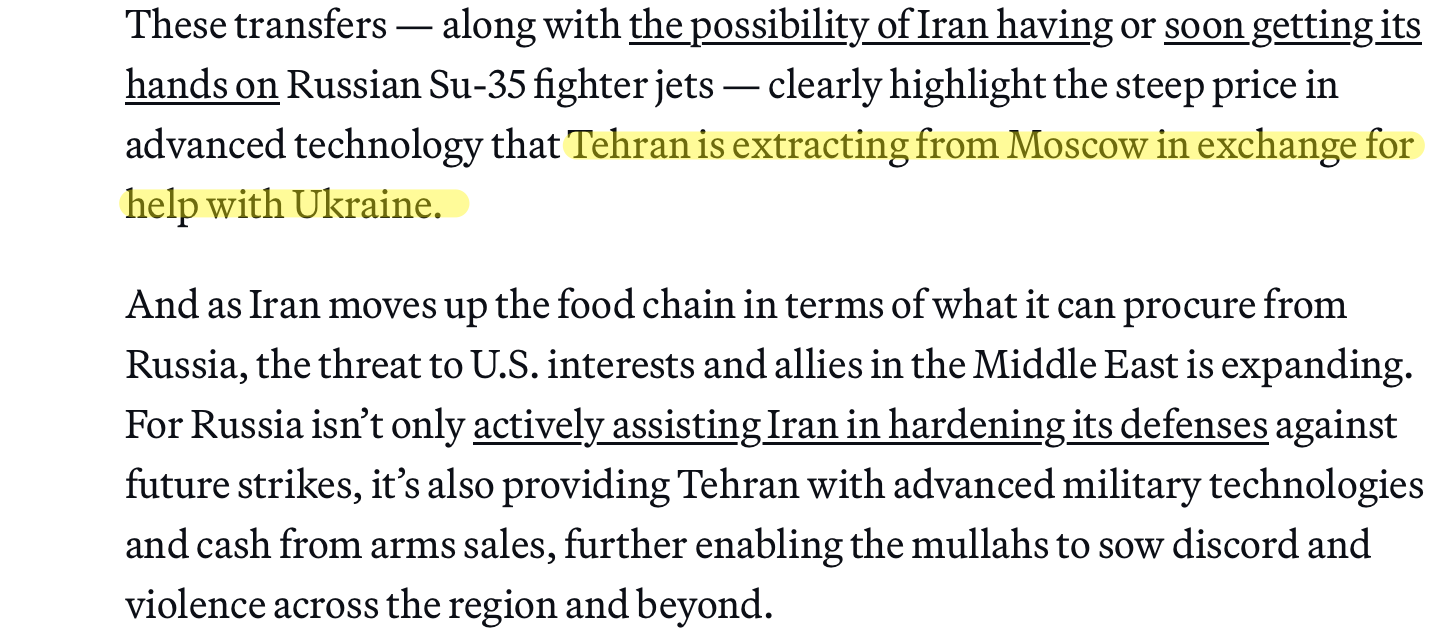 Russia made some kind of deal with Iran, a desperate deal, which in 2022 provided the Russians with the most advanced drone technology in the world. Now, we are watching the Russians have to cough up the steep price: