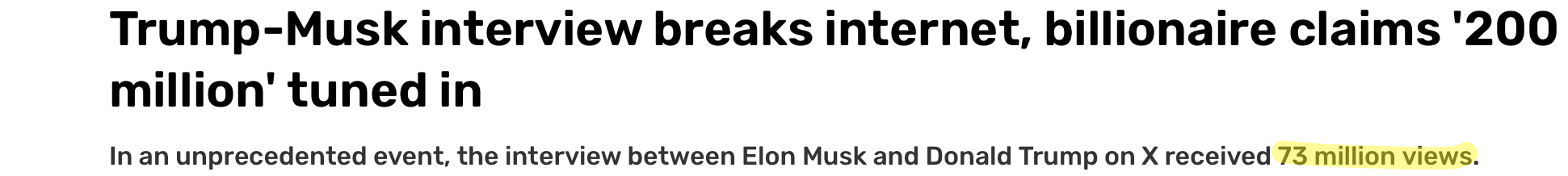 The Wall Street Journal was perhaps the only U.S. platform to report it straight: “Trump and Musk, on X, Discuss Immigration and Shared Vision for U.S..” Having done that much, the Journal maniacially focused on the interview’s initial 35-minute delay (Musk said it was a DDOS attack), and never mentioned how many folks tuned in.