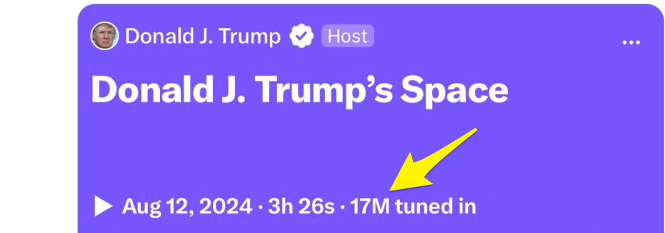 Setting that aside, Trump set history last night in what was probably the biggest Twitter Space in history. The last record was set when Elon Musk interviewed Ron DeSantis (300K concurrent listeners). Some sources showed over 17 million concurrent listeners tuned in for Elon’s Trump interview: