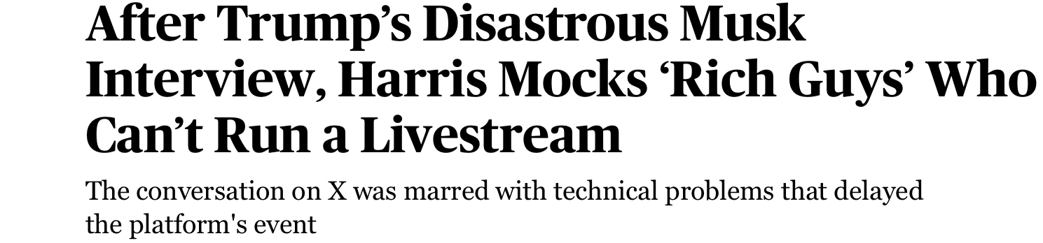 Corporate media was panicking long before the interview began. At yesterday’s White House press briefing, in a hilarious self-own, a Washington Post reporter actually asked whether the Biden Administration planned to “stop” the Musk-Trump interview (because of misinformation):