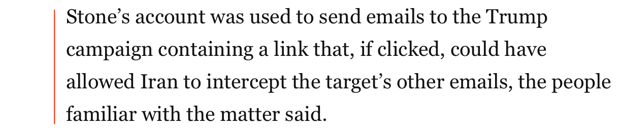🔥🔥 Good news everyone! The FBI is on the case. The Washington Post ran the story yesterday headlined, “FBI probing alleged Iran hack attempts targeting Trump, Biden camps.” Whew! I know I feel better now. How about you?
