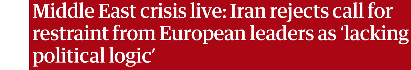 🚀🚀 War Update: The good news was that Iran has not (yet) attacked anybody. But yesterday, the media relentlessly beat the war drums of bad news until media’s parents told it to stop making all that ruckus and go to bed. Here are four quick headlines to get you up to speed. First, the UK Guardian reported the Iranians are wondering why every time they get attacked, people always tell Iran to use restraint: