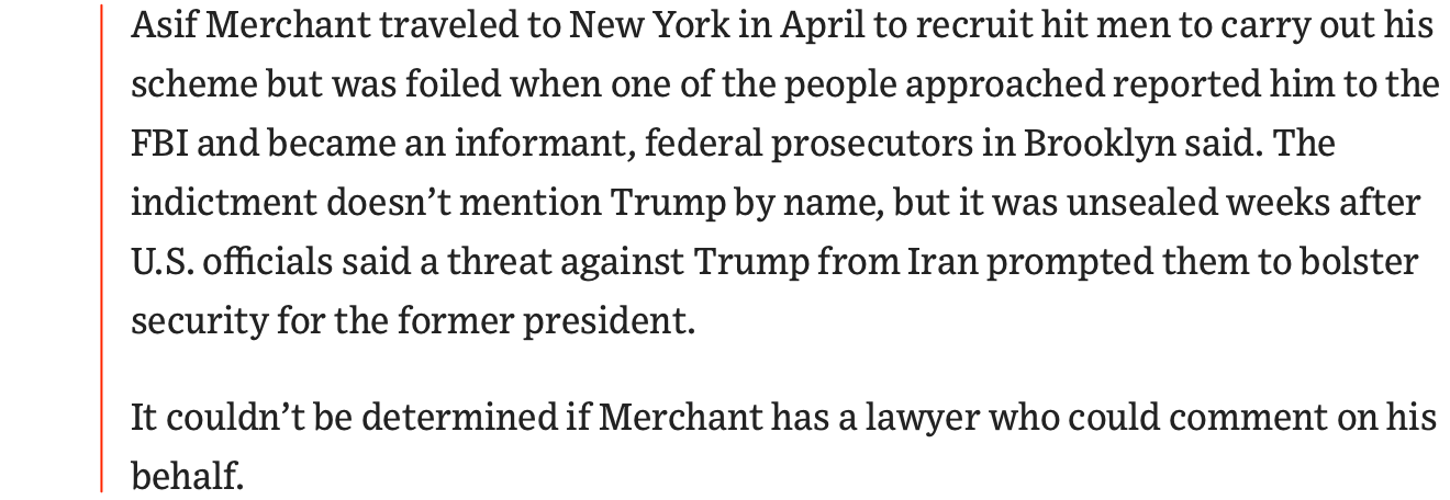 They unsealed this weird indictment? Why? And, Merchant doesn’t even have a lawyer? And what kind of name is Merchant for an Iranian assassin? Wasn’t ‘Merchant’ the same name as one of Trump’s judges? (Or was it ‘Merchan’?)