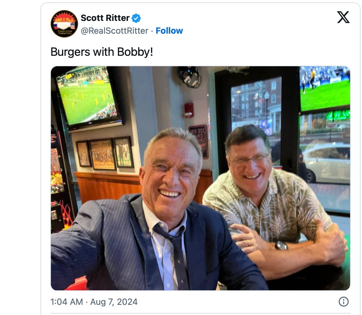 🚀🚀 Fox ran a story yesterday headlined, “FBI raids New York home of former UN weapons inspector Scott Ritter: 'Ongoing federal investigation’.” The sub-headline added, “The raid came a day after Ritter posted a photo of himself with independent presidential candidate Robert F. Kennedy Jr.” So, be aware of the possibilities whenever you pose for selfies.