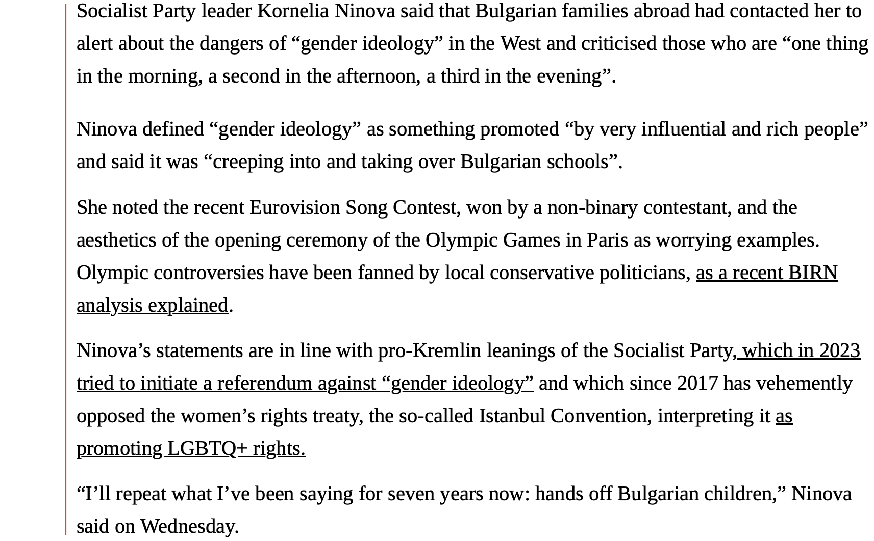 Note Ms. Ninova’s reference to the opening ceremonies from this year’s Summer Olympics in Paris. One wonders how much that eye-searing display contributed to Tuesday’s “unexpected” anti-LGBTQ+ vote in Bulgaria’s parliament. May that obscene spectacle continue to bear fruit.