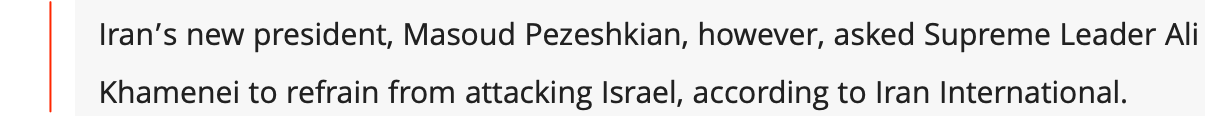 This is welcome news for two reasons. First, President Pezeshkian should have been most offended by the assassination of the Hezbollah ‘guest’ on his inauguration. So his opinion has weight beyond the strength of his office. Second, the news of what must have been a very private conversation between the two Iranian leaders was obviously deliberately leaked to Iranian media, proving the regime is not operating out of pure testosterone and sandy hubris.