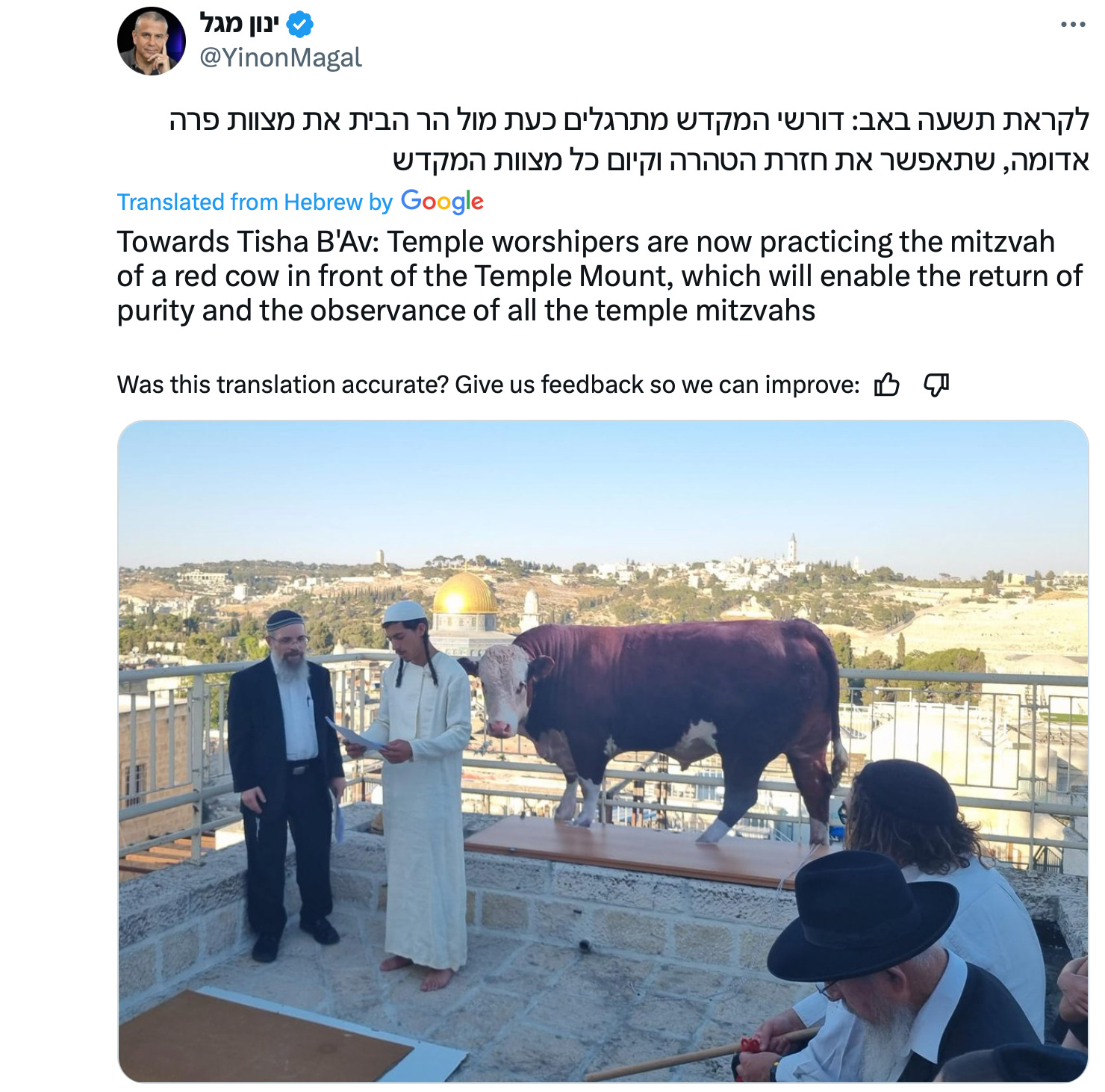 🔥🔥 In Middle East news of the weird, yesterday an Israeli journalist tweeted a picture showing some Jewish clerics ‘practicing’ the so-called “Red Heifer sacrifice” near the Temple Mount in Jerusalem, using a cardboard mockup, which I am told is less effective than one that says ‘moo.’ It all started back in 2022, when an orthodox group of Israelis dedicated to rebuilding the Jewish Temple bought five very expensive candidate cows from a Texas rancher, who probably retired right after that. But most significantly, Hamas blamed its barbaric October 7th attacks, in part, on these heifers. Cows, again.
