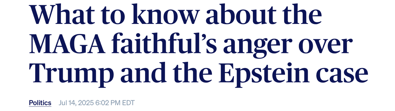 Maybe they aimed to put Trump in an impossible fix: either don’t release, and break his promises, or release, and get manufactured Epstein spooge all over himself and every other significant Republican. Headline from WaPo, Wednesday: