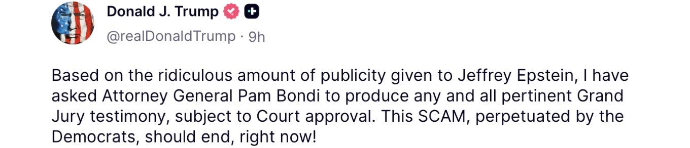 Forget about predicting it; the Epstein story defies description. It isn’t just a scandal, it’s a whole genre; somewhere between political thriller, true crime, and cold war noir. We’ll have to wait impatiently for the grand jury materials to appear. We’ve officially entered Disclosure Phase 1, thanks to Trump’s move to unseal the one document they didn’t get to rig.