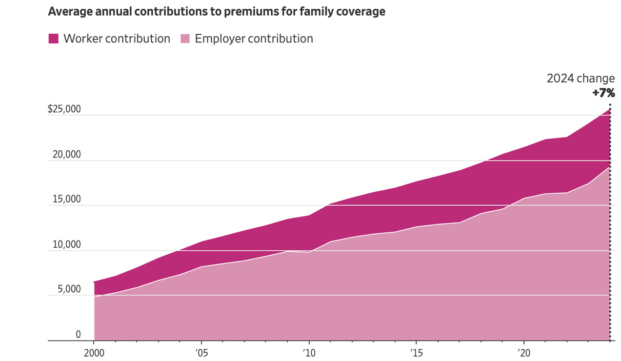 The Journal’s figures showed that, despite its alleged “easing” of inflation, the average family is now paying roughly $25,500 in annual healthcare premiums. In other words, the average family is buying the healthcare industry a Honda Civic every single year.
