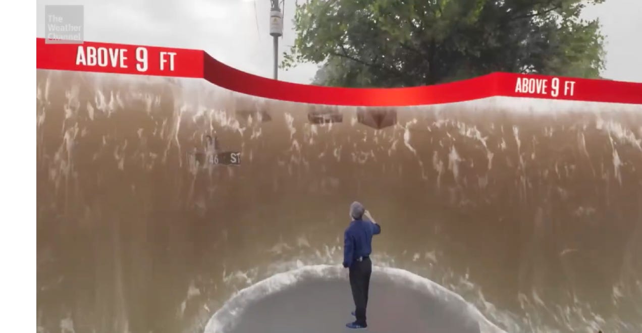 NOAA’s current forecast optimistically predicts further weakening to a Category 3 storm when it lands on Florida. Hopefully that bears out, but folks around here in North Central Florida are edgy since these storms have been acting so weird. Things are much crazier on the state’s west coast, where NOAA is currently forecasting a 10-15 foot storm surge in Tampa Bay — which would cover the roofs of most houses.