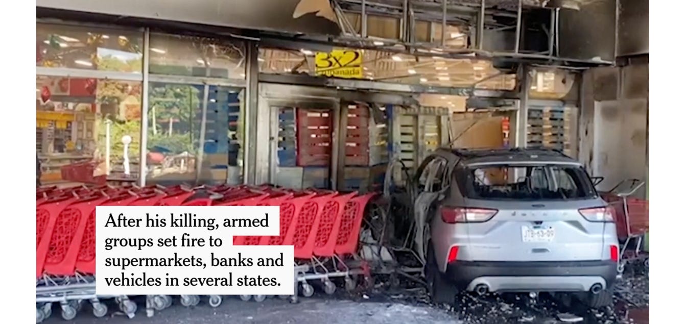 🔥 Over the weekend, the now-leaderless cartel expressed its grief in traditional Latin American fashion, by setting fire to Costco, torching businesses across six states, triggering an airport shutdown at otherwise scenic Puerto Vallarta, and stranding tourists from United, American, Air Canada, and Aeromexico. In other words, a slightly below-average Mexican vacation.