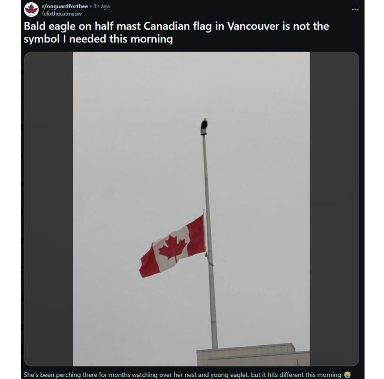 I can’t verify this, but yesterday afternoon, Canadian social media was glumly re-posting an image of a bald eagle that apparently landed on the half-lowered flag at the Canookian Capitol: