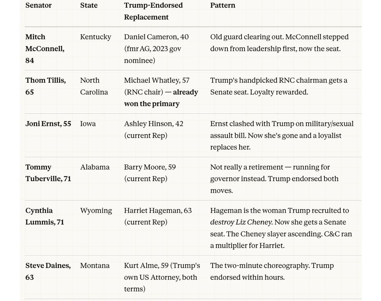 So I dug into the six senators. Buckle up. What looks like a retirement wave is in fact a personnel rotation. Every departing senator is being replaced by a Trump-endorsed loyalist. In three cases —Michael Whatley, Harriet Hageman, Kurt Alme— the replacement is someone Trump personally installed in a prior role— his RNC chairman, the woman he recruited to take out Liz Cheney, and his own US Attorney under Trump 1.0 and 2.0.