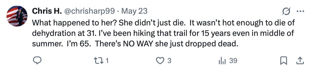 Another one. The New York Post ran a troubling story last week, headlined “Hiking influencer Hannah Moody’s cause of death revealed after being found dead on Arizona trail.” I’ll spoil the mystery: it was climate change.