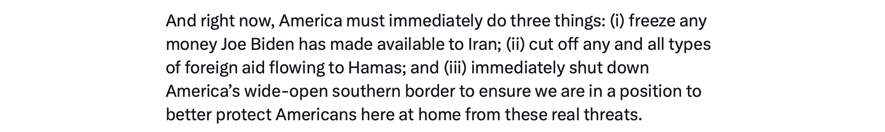 🔥 Also yesterday, Governor DeSantis — I have intel suggesting he got our letter — connected the dots between what’s happening in Israel and our own border problem. In an yesterday’s extended tweet expressing support for Israel, Governor DeSantis concluded with a three-part action plan ending with fixing America’s broken border: