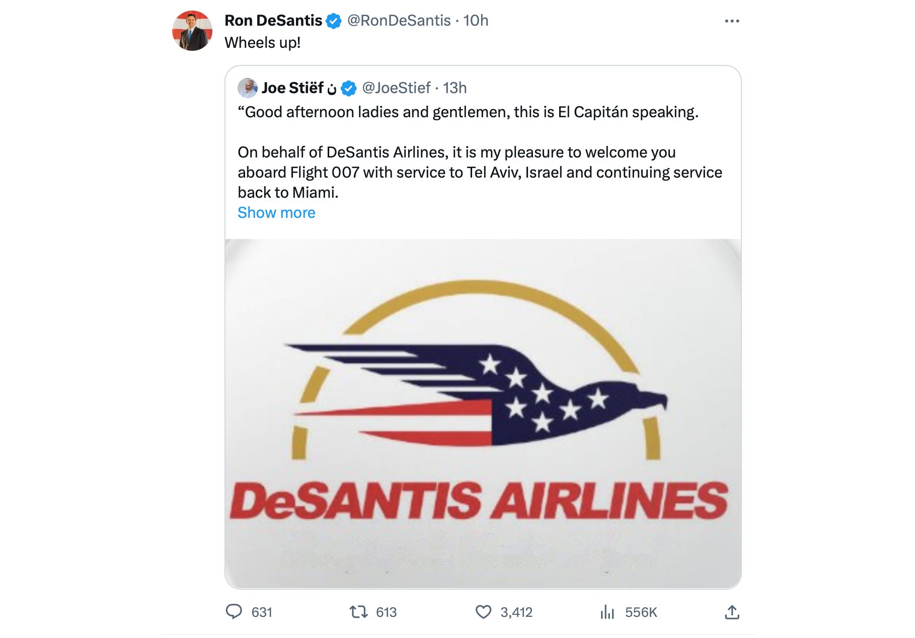 ✈️ Politico ran a very encouraging story yesterday headlined, “DeSantis orders Florida to organize charter flights for Americans stranded in Israel.”