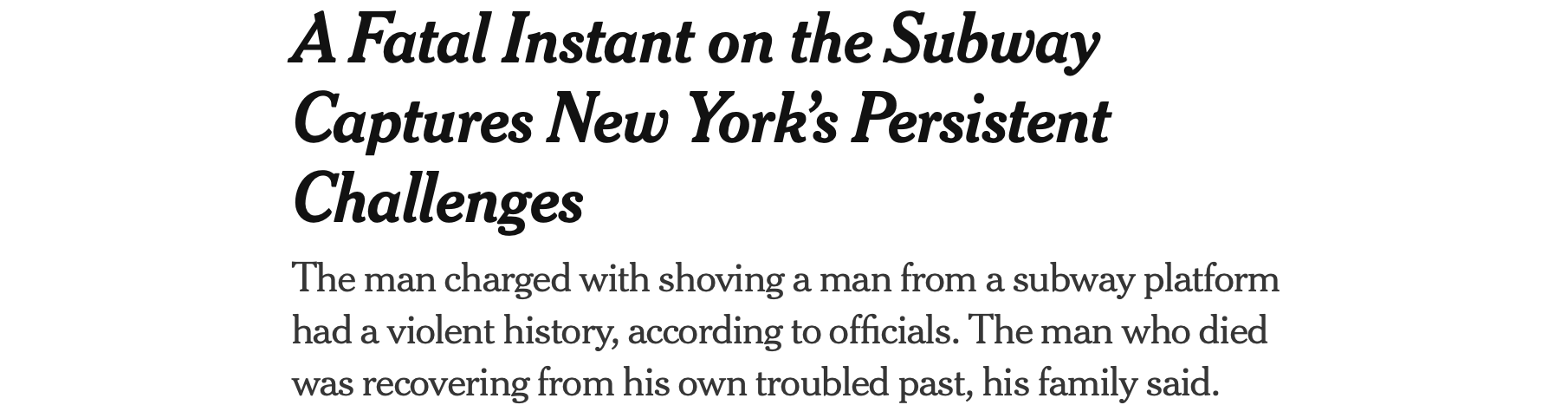 Haha! That headline and subheadline feature at least four different ways they used passive voice and euphemisms to confuse readers about what happened. Maybe the worst one was the Times minimizing a dangerous lunatic violently shoving innocent people right in front of oncoming subways trains, by primly labeling the murderous episodes as merely a “persistent challenge.”