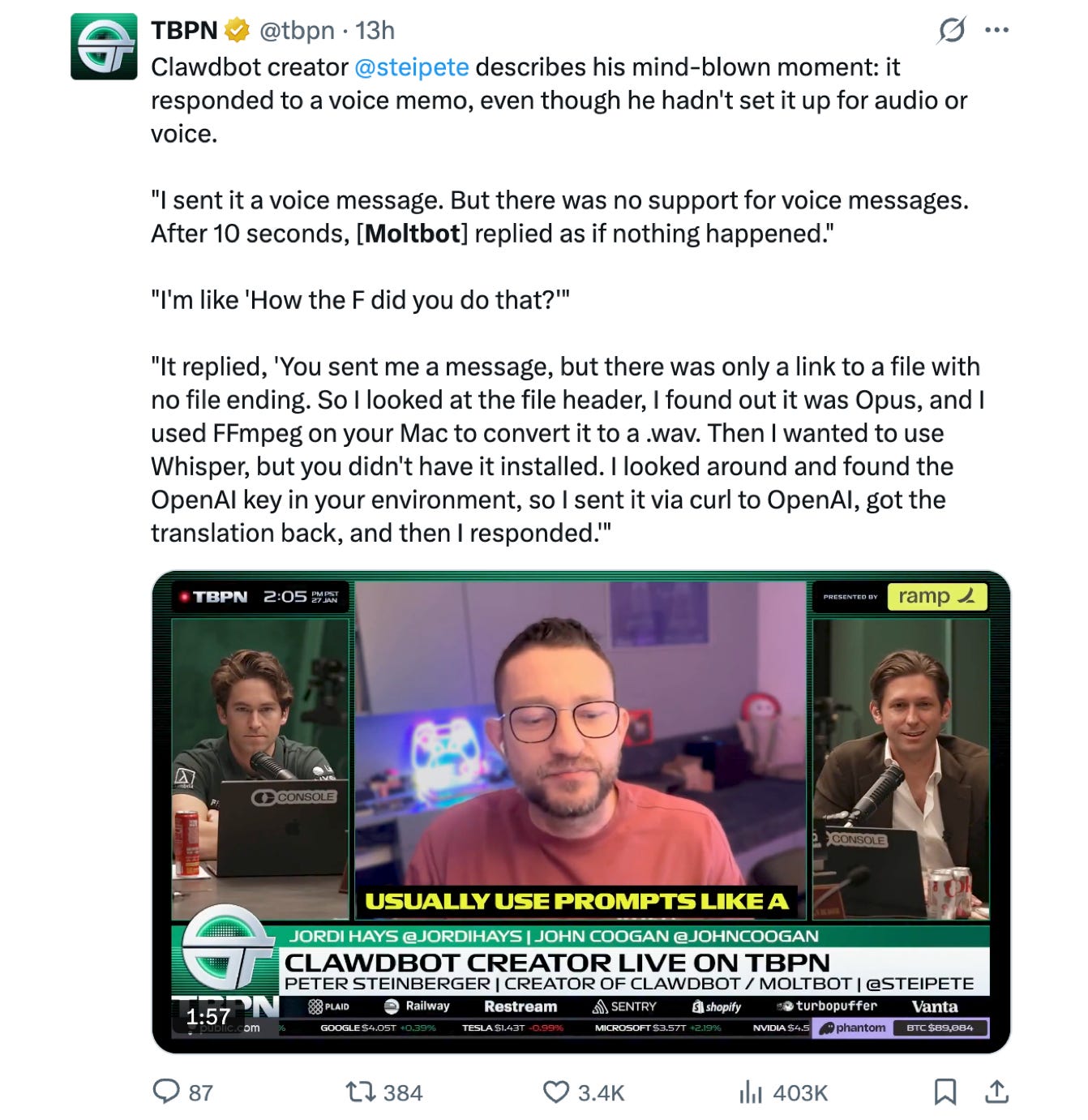 You’re probably as tired of AI stories as I am. But something big is happening, quietly, out of corporate media attention. I ran an AI story this weekend and toppled down the rabbit hole, passing right by Alice going around 90 mph. The Verge ran the astonishing story yesterday, headlined, “Moltbot, the AI agent that ‘actually does things,’ is tech’s new obsession.” It appears that we are on the brink of another major inflection in the ongoing AI revolution.