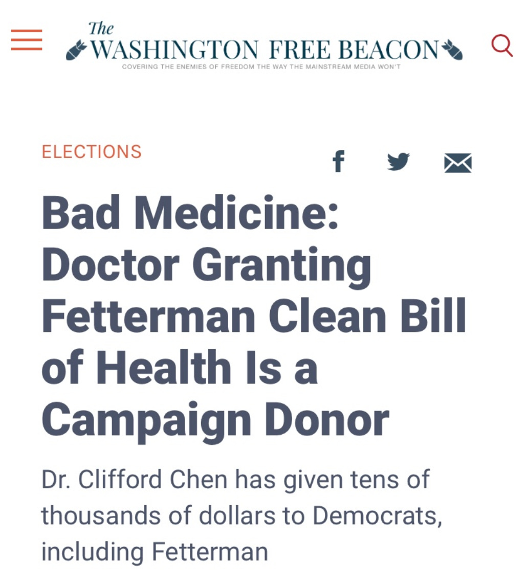 But, it’s sort of unclear why Fetterman would be rushed to the hospital for feeling lightheaded anyway, since his “doctor” — who donated to his campaign — gave him a clean bill of health back in October: